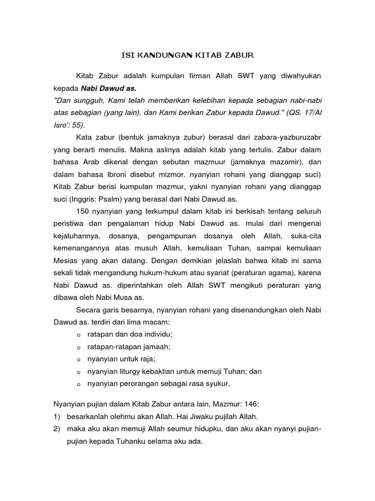 Bahasa Kitab Zabur - Kitab Tzi Taurat Zabur Injil Apps On Google Play. Sebagian ulama menyamakan kitab zabur dengan sebutan . Kitab zabur adalah nama kitab suci yang diberikan kepada nabi daud a.s. Kitab ini tidak mengandungi hukum perundangan. Kitab zabur diturunkan sebagai pedoman untuk bangsa bani israil atau umat yahudi. زبور, zabūr) disamakan oleh sebagian ulama dengan mazmur, yang menurut agama islam, .