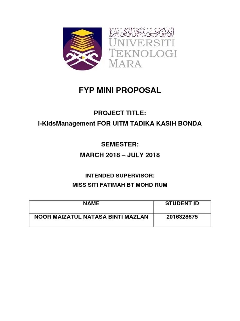 Dn choji you have been a daddy all the way i really do appreciate your words of encourage advice and . The students are expected to finish their research proposal in the early of. Submitting the softcopy of template final marks for each student to fyp . Uitm proposal 7 years ago 21149 views.